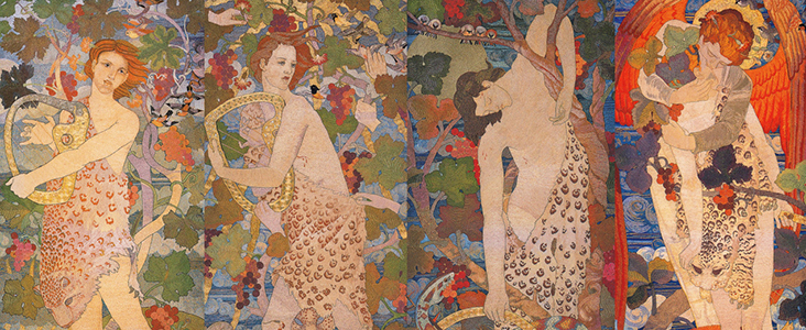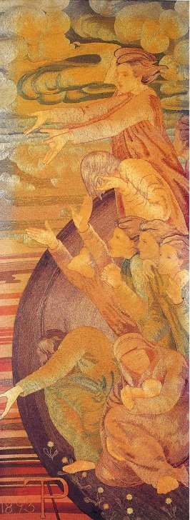 This is the first from a suite of four embroidered panels which follow the journey of the human soul to heaven. It illustrates the happy stage of hope and innocence when the soul is in tune with nature, unaware of the realities of life. The theme was inspired by a performance of Richard Wagner’s opera Parsifal, which premiered in Germany in 1882. It was also loosely based on Denys L’Auxerrois (1887) by Walter Pater (1839-1894), a tale about the god Dionysus living as a priest in medieval France.